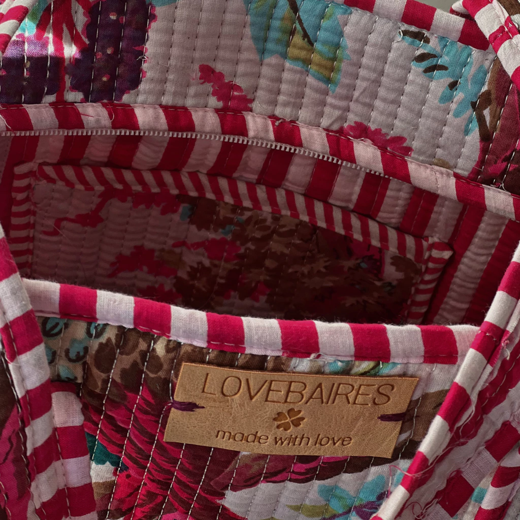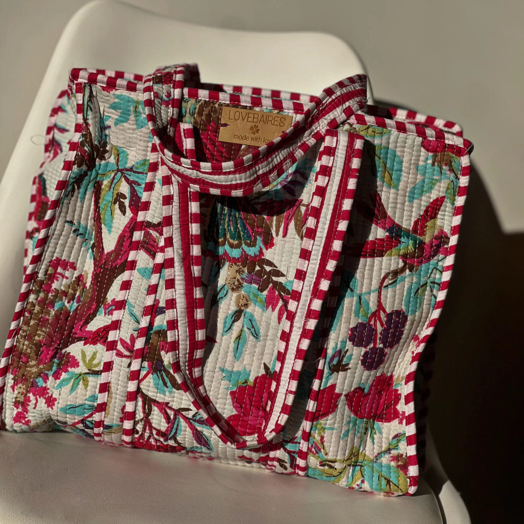 Este bolso tote de algodón acolchado, cuidadosamente elaborado, está impreso mediante la técnica Blockprint, ofreciendo un encanto artesanal único.